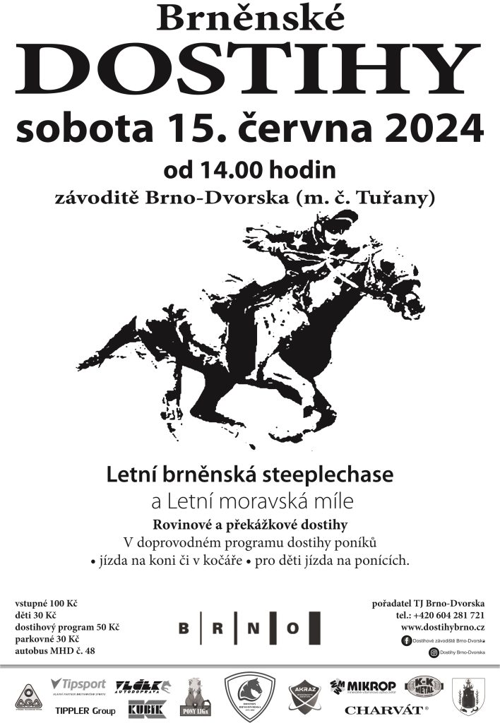 Věděli jste, že nejstarší dostihový závod se běžel, samozřejmě v Anglii, v roce 1519, tedy před 505 lety!? Závody na dostihové dráze Brno-Dvorska se konají od roku 1997. Tedy krásných 27 let vás můžeme zvát na toto závodiště na rovinové i překážkové dostihy, závody poníků a mnohé další. Nenechte si ujít druhý dostihový den letošní sezóny, a to v sobotu 15.06.2024 od 14 hod. ![]()
