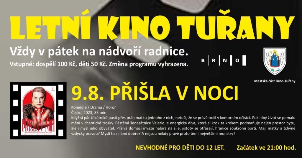 Úřad městské části Brno-Tuřany Vás zve na promítání letního kina, které se uskuteční na nádvoří radnice v pátek 9.8.2024. Těšit se můžete na hororovou komedii Přišla v noci. Začátek projekce je ve 21 hodin. Vstupné činí 100 Kč pro dospělé a 50 Kč pro děti. Občerstvení zajištěno.