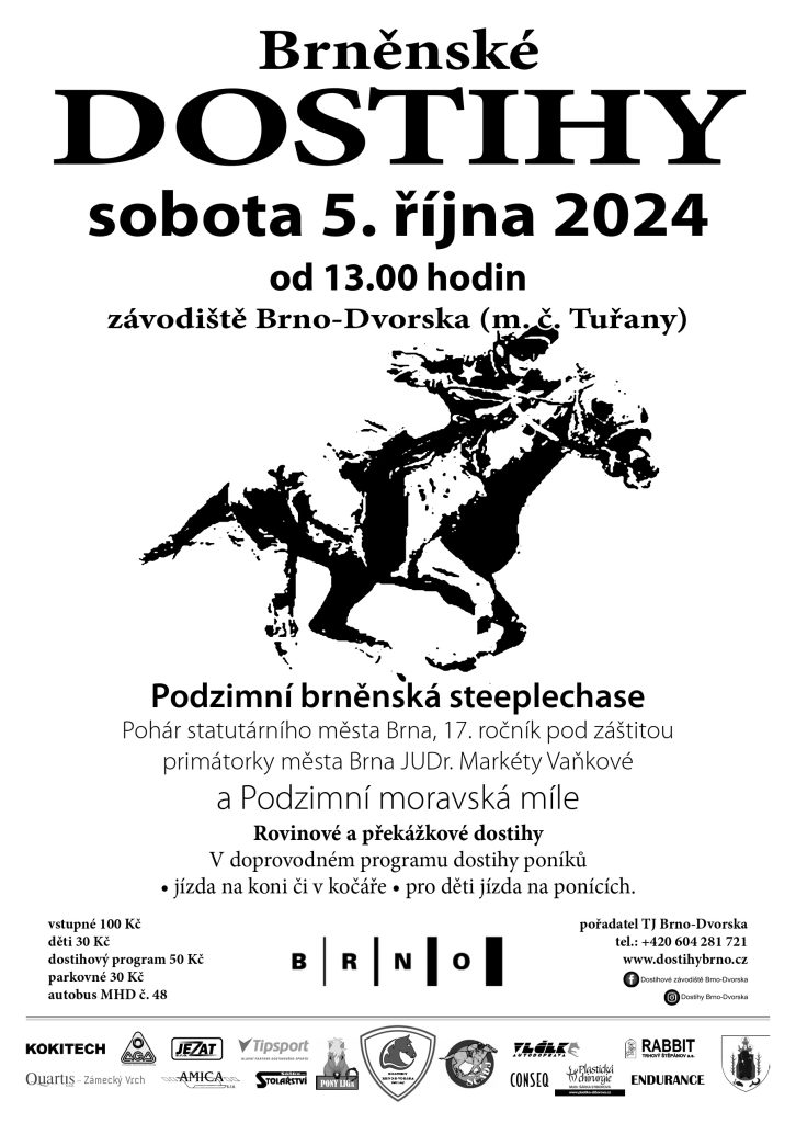 V sobotu 5.10.2024 od 13:00 hodin se v areálu dostihového závodiště v Brně-Dvorskách uskuteční poslední dostihový den v roce 2024. Nenechte si tuhle přehlídku mimořádných výkonů ujít.