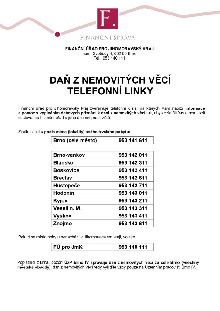 Finanční úřad pro Jihomoravský kraj zveřejňuje telefonní čísla, na kterých nabízí informace a pomoc s vyplněním daňových přiznání k dani z nemovitých věcí.