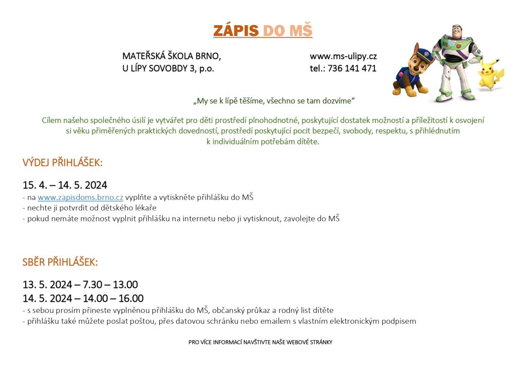 Zápis do MŠ proběhne v termínu 15. 4. – 14. 5. 2024 (výdej přihlášek), sběr přihlášek proběhne 13. 5. 2024 7.30 – 13.00 hodin a 14. 5. 2024 – 14.00 – 16.00 hodin.