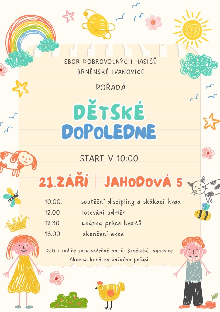 JSDH Brněnské Ivanovice vás srdečně zvou na dětské dopoledne 21.9.2025 od 10 hod na hasičce, ul. Jahodová 5. Akce se koná za každého počasí, tak přijďte si s dětmi užít krásnou neděli.