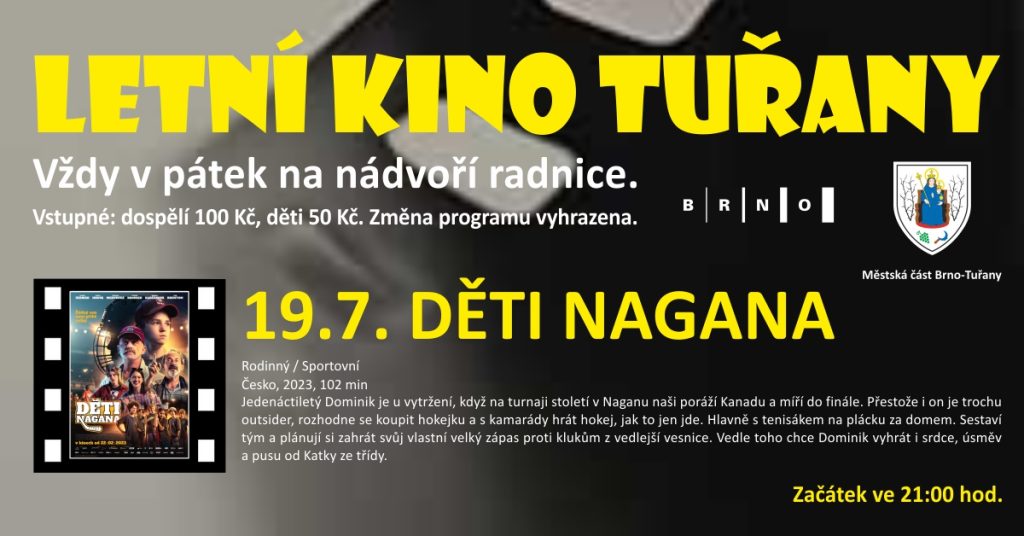 Úřad městské části Brno-Tuřany Vás zve na první promítání letního kina, které se uskuteční v pátek 19.7.2024 na nádvoří radnice. Promítat se bude sportovní rodinný film Děti Nagana. Začátek projekce je ve 21 hodin. Vstupné činí 100 Kč pro dospělé a 50 Kč pro děti. Občerstvení zajištěno.