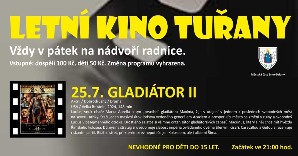 Tento pátek 25.7.2025 se můžete těšit na dobrodružný film Gladiátor II. Občerstvení zajištěno od Toulavý bistro. Začátek promítání je ve 21 hod. Vstupné činí 100,- Kč pro dospělé a 50,- Kč pro děti. Nevhodné pro děti od 15 let.