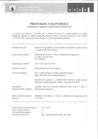 • MŠ V Aleji – protokol o kontrole