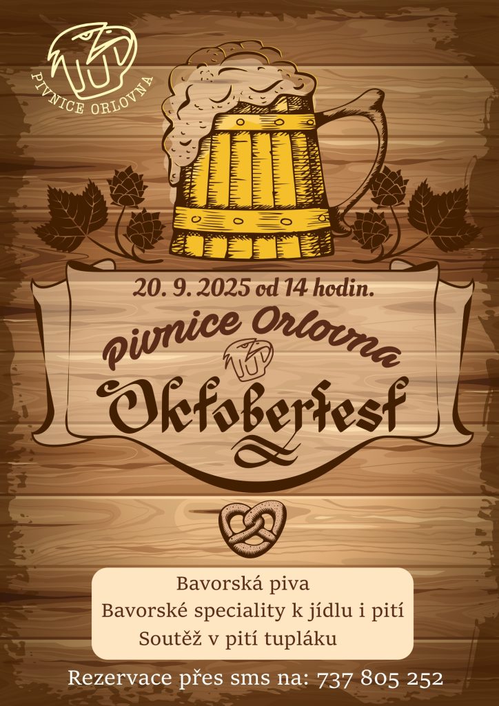 Pivnice Orlovna vás zve v sobotu 20.9.2025 od 14 hod na ochutnávku pivních specialit, výborného jídla a bavorské nálady. Těšit se také můžete na soutěž v pití tupláků. Doporučujeme rezervovat si svůj stůl.