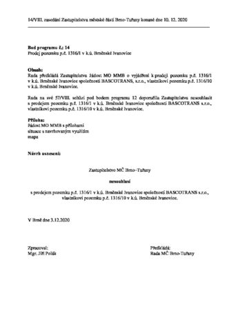 Bod č. 14 – Prodej pozemku p.č. 1316_1 v k.ú. Brněnské Ivanovice