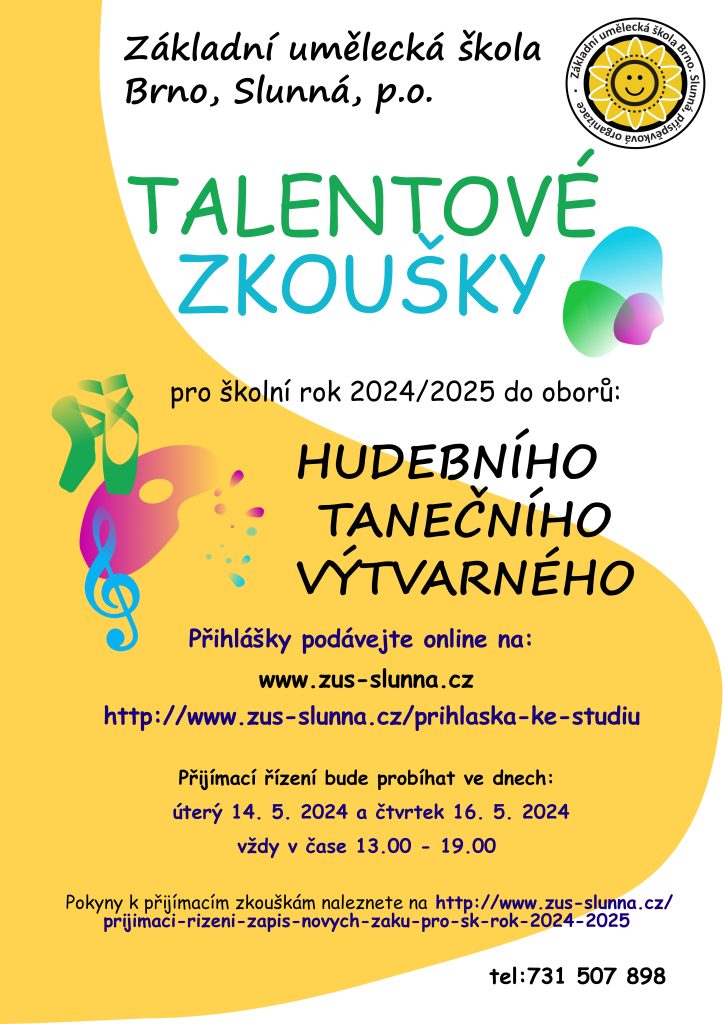 ZÚŠ Slunná zve na talentové zkoušky hudebních, výtvarných a tanečních oborů. Přijímací řízení budou probíhat ve dnech 14.05.2024 a 16.05.2024 vždy od 13 hod do 19 hod.