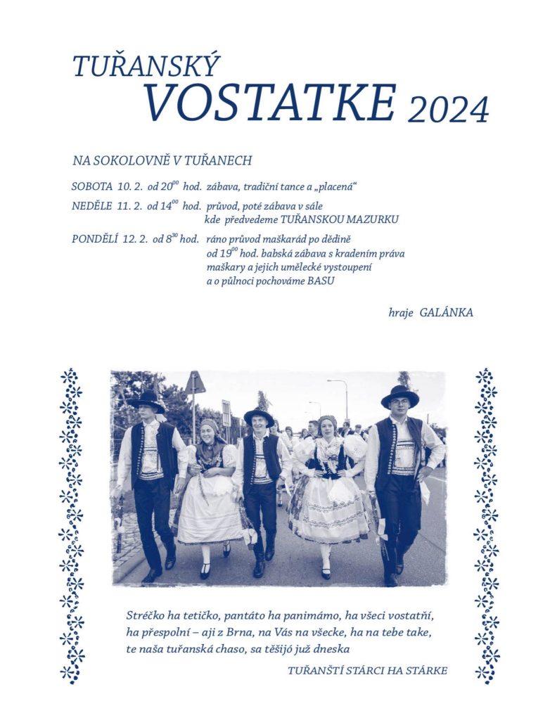 Tradiční Tuřanský Vostatke začínají v sobotu 10.2.2024 krojovanou zábavou na sokolovně v Tuřanech od 20 hod. Nedělní krojovaný průvod vychází ve 14 hod. V pondělí ráno se dědinó proženó maškarády a od 19hod na sokolovně se můžete těšit na přehlídku babských i pracovních krojů, bláznivé vystoupení a pochování basy.