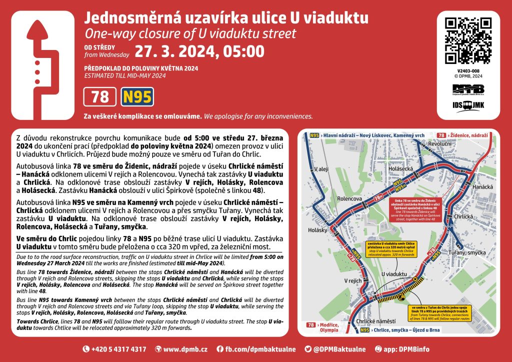 Z důvodu rekonstrukce povrchu komunikace bude od 5:00 ve středu 27. března 2024 do ukončení prací (předpoklad do 3. května 2024) omezen provoz v ulici U viaduktu v Chrlicích. Průjezd bude možný pouze ve směru od Tuřan do Chrlic.