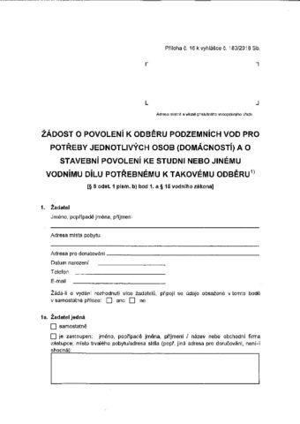 Žádost o povolení k odběru podzemních vod pro potřeby jednotlivých osob (domácností) a o stavební povolení ke studni nebo jinému vodnímu dílu potřebnému k takovému odběru Úvod