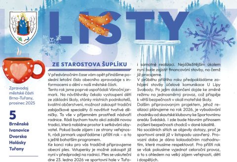 V předvánočním čase vám opět přinášíme poslední letošní číslo obecního zpravodaje s informacemi o dění v naší městské části. Tento rok jsme poprvé uspořádali Vánoční jarmark. Na návštěvníky čekalo vystoupení dětí ze základní školy, stánky místních podnikatelů, kvalitní občerstvení, možnost zakoupit tradiční zabijačkové speciality či navštívit tvořivé dílničky. To vše v příjemném prostředí nádvoří radnice. Rádi bychom touto akcí založili novou tradici, která nabídne prostor k setkávání obyvatel.